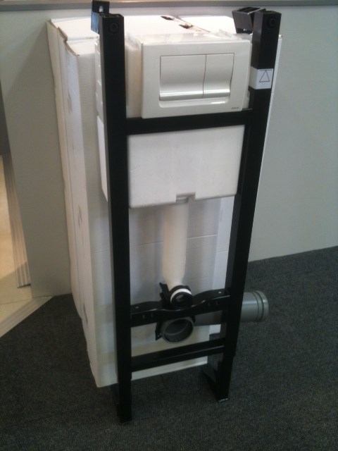 Bati-support UNIVERSEL pour WC suspendu avec mécanisme DOUBLE CHASSE 3/6 litres , plaque de commande blanche ( 2 formes au choix ) , MODELE AUTOPORTANT mais avec 4 points de fixations ( sol et mur ) , livré avec fixations de la cuvette et coude de raccordement de l'évacuation.